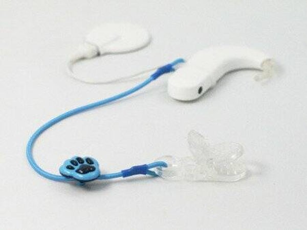 - Enkele clip met ornament voor een hoortoestel of processor (cochlear implantaat).