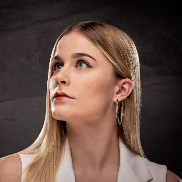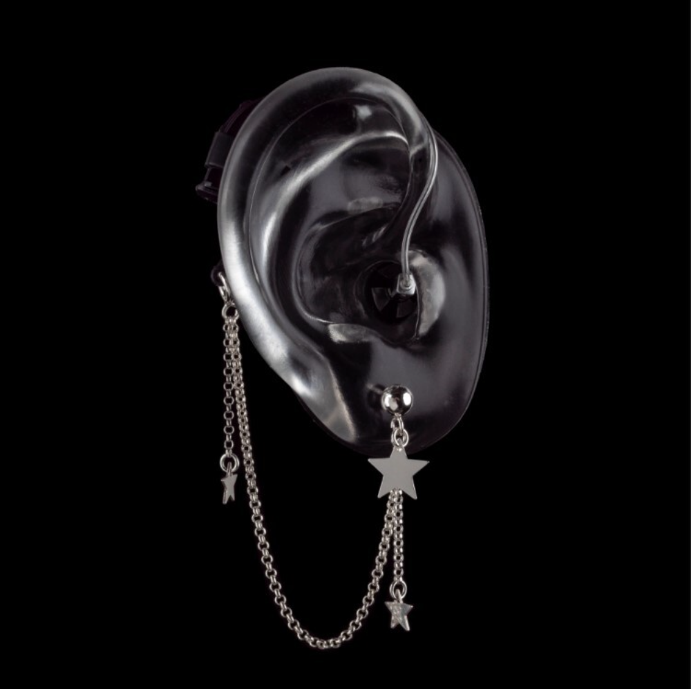 Een opvallende sterrenhemel sieraad van Deafmetal® met drie sterren aan twee zilveren kettingen. Wordt aan het oor bevestigd met een ronde zilveren oorbel. Zo leuk!